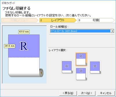 フチなし印刷する場合の最大印刷長は、ロール紙幅の14.22倍または18.0 m(708.7 inches)の小さい方となります。