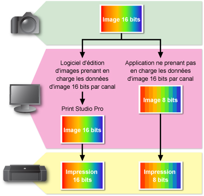 Lors du réglage des couleurs dans le logiciel d'édition d'image, un réglage à 16 bits par canal atténue la dégradation de la qualité de l'image en raison des bandes (exécution du dégradé). Par ailleurs, l'impression des images de la plage dynamique haute (flux de 16 bits intégral) produit des dégradés plus lisses par rapport aux impressions des images 8 bits par canal.