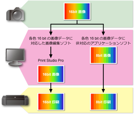 Print Studio Proは各色16 bitの画像データに対応しているので、画像編集ソフトからデータを劣化させることなくそのまま受け取り、ハイダイナミックレンジ(各色16 bitワークフロー)で印刷できます。