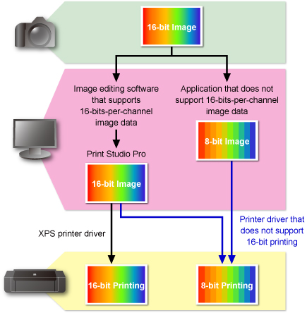 When performing color adjustment in image editing software, adjusting in 16 bits per channel reduces degradation of image quality due to banding (gradient stepping). In addition, printing High Dynamic Range images (full 16-bit workflow) produces smoother gradations compared to printing 8-bits-per-channel images.