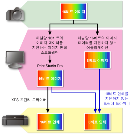 이미지 편집 소프트웨어에서 컬러 조절을 수행할 때 채널당 16비트 환경에서 조절하면 밴딩(그라데이션 계단 현상)으로 인한 이미지 품질 저하를 줄일 수 있습니다. 또한 HDR(High Dynamic Range) 이미지(전체 16비트 워크플로)로 인쇄하면 채널당 8비트 이미지에 비해 부드러운 그라데이션을 만들 수 있습니다.