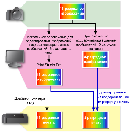 При выполнении настройки цветов в редакторе изображений настройка в режиме 16 разрядов на канал снижает качество изображения из-за объединения (пошагового изменения градиента). Кроме того, печать изображений с высоким динамическим диапазоном (полный 16-разрядный поток) формирует более ровные градации, если сравнивать с печатью изображений по 8 разрядов на канал.