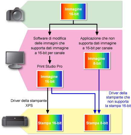 Quando si esegue la regolazione del colore nel software di modifica delle immagini, la regolazione a 16 bit per canale attenua la riduzione della qualità dell'immagine a causa dell'effetto banding (posterizzazione). Inoltre, la stampa di immagini High Dynamic Range (flusso di lavoro a 16 bit completi) crea gradazioni più omogenee rispetto alla stampa di immagini a 8-bit per canale.