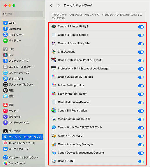 [システム設定]→[プライバシーとセキュリティ]→[ローカルネットワーク]を選ぶ