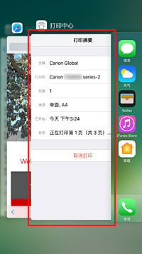 单击iOS设备中的主屏幕按钮两次,切换到多任务模式,向右滑动显示打印中心,然后点击。