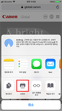 iOS 12의 Safari에서 인쇄할 경우 다음 화면이 나타납니다. 장치 또는 어플리케이션에 따라 화면이 다릅니다.