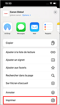 L'écran suivant s'affiche lorsque vous imprimez à partir de Safari pour iOS 12. L'écran peut varier en fonction des périphériques ou des applications.