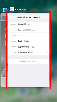 - Sur un périphérique iOS : touchez Centre d'impression qui s'affiche en mode multitâche. Dans l'écran qui s'affiche, touchez sur la tâche d'impression à supprimer, puis touchez Annuler l'impression.