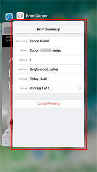- من جهاز iOS: انقر فوق Print Center الذي يظهر في وضع تعدد المهام. وفي الشاشة التي تظهر، انقر فوق مهمة الطباعة المراد حذفها، ثم انقر فوق إلغاء الطباعة (Cancel Printing).