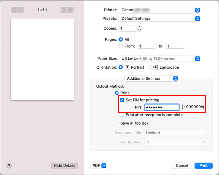 Aktivieren Sie die Option PIN z. Drucken festlegen (Set PIN for printing) und geben Sie eine ein- bis siebenstellige Ziffer im Feld PIN ein.