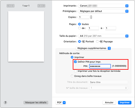 Cochez l'option Définir PIN pour impr., puis saisissez un nombre de un à sept chiffres dans PIN.