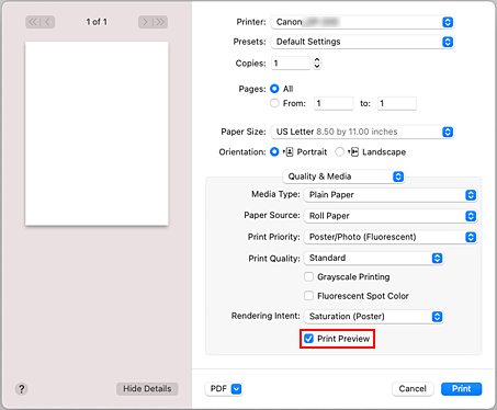 Quando si esegue la stampa, avviare Canon imagePROGRAF Preview per visualizzare i risultati di stampa.