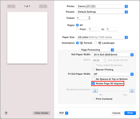 Marque a caixa de seleção Girar a página em 90 graus (Rotate Page 90 degrees).