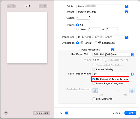 Ao imprimir em papel em rolo, você pode economizar papel ao reduzir as margens superior e inferior na impressão.