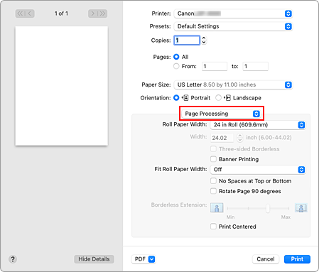 Wählen Sie im Popupmenü Seitenverarbeitung (Page Processing) aus.