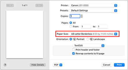 Wählen Sie "XXX Randlos" unter Papierformat (Paper Size) im Druckdialogfeld aus.