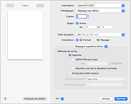 Ce paramètre peut être défini lorsque vous sélectionnez Imprimer.