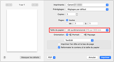 Dans la boîte de dialogue Imprimer, sélectionnez « XXX surdimensionné » pour Format papier (Paper Size).