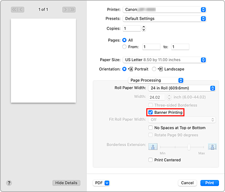 - Se è selezionata l'opzione "Senza bordo XXX" o "Foglio singolo XXX"per Formato carta (Paper Size) nella finestra di dialogo Stampa, l'opzione Stampa intestazione (Banner Printing) è inattiva e non può essere impostata.