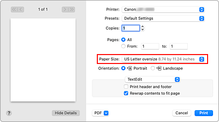 Nella finestra di dialogo Stampa, selezionare "XXX Sovradimensione " per Formato carta (Paper Size).