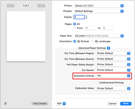 참고- 자동 절단의 기본 설정은 예(Yes)입니다.