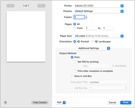 Salve o trabalho de impressão no disco rígido da impressora. Ao selecionar Salvar em Caixa Trabalho (Save in Job Box), selecione a caixa individual para salvar a partir da lista Nº caixa de trabalho (Job Box No.).