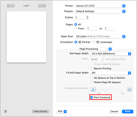 Quando você quiser posicionar o documento original no meio do papel cortado e imprimir, ou então imprimir com margens iguais na direita e na esquerda com relação ao comprimento do papel em rolo, use a função Imprimir centralizado (Print Centered).
