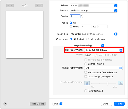 Для параметра Ширина рулона бумаги (Roll Paper Width) выберите ширину рулона бумаги, загруженного в принтер.