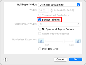 - Cuando se selecciona "XXX Sin bordes" o "XXX Hoja cortada" para Tamaño de papel (Paper Size) en el cuadro de diálogo de impresión, Imprimir título (Banner Printing) se muestra atenuado y no se puede establecer.