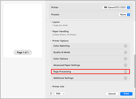 Selecione Processamento de página (Page Processing) em Opções da Impressora (Printer Options)
