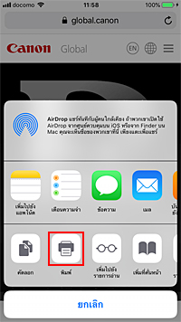 ข้อสำคัญ- เนื่องจากมีบางแอพพลิเคชั่นที่ไม่รองรับ AirPrint ดังนั้น ตัวเลือกเครื่องพิมพ์(Printer Options) อาจไม่แสดงขึ้น หากแอพพลิเคชั่นไม่อนุญาตให้คุณใช้ตัวเลือกเครื่องพิมพ์ คุณจะไม่สามารถพิมพ์จากแอพพลิเคชั่นดังกล่าวได้