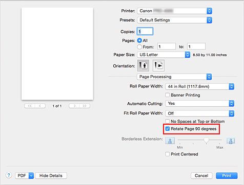 - Wenn das Papier im Druckdialogfeld unter Papierformat (Paper Size) im Hochformat ausgerichtet wird, kann Seite um 90 Grad drehen (Rotate Page 90 degrees) unterRollenpapierbreite (Roll Paper Width) nicht verwendet werden, wenn die ausgewählte Breite überschritten wird.