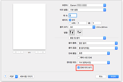 - PDF에서 Canon imagePROGRAF Preview를 선택한 경우에도 인쇄 결과를 표시할 수 있습니다.