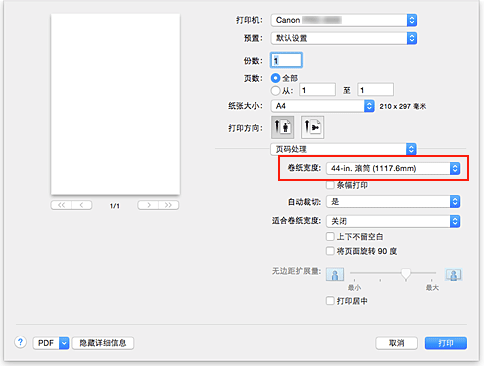 - 在操作面板上,如果将设备设置 -> 纸张相关设置 -> 卷纸自动转换设置为不识别尺寸,可能会在错误的卷纸上打印文档。 Canon建议在打印前将此项设置为识别尺寸。