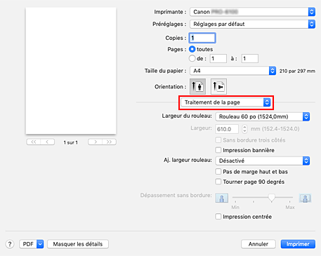 Sélectionnez Papier rouleau (Auto), Rouleau 1 ou Rouleau 2 sous Alimentation papier, en fonction de vos besoins.