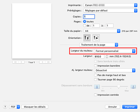 Si vous effectuez l'impression, le papier rouleau avec la largeur spécifiée sera utilisé pour l'impression.