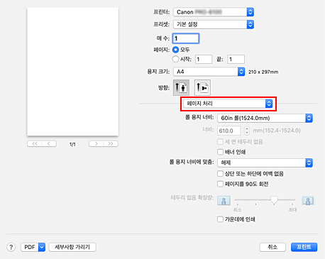용지 공급(Paper Source)에서 롤 용지를 선택한 경우 롤 용지 너비(Roll Paper Width)를 프린터에 로드된 롤 용지의 너비로 설정합니다.