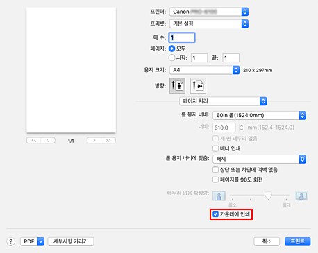 - 프린트 대화 상자에 있는 용지 크기(Paper Size)에서 "XXX 테두리 없음"을 선택하면 가운데에 인쇄(Print Centered)는 회색으로 표시되고 선택할 수 없습니다.