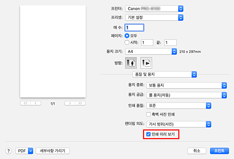 • PDF에서 Canon imagePROGRAF Preview를 선택한 경우에도 인쇄 결과를 표시할 수 있습니다.