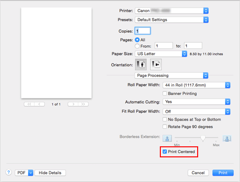 - Bei Einstellung auf den Druck des gesamten Blattes ohne Ränder wird die Option Zentriert drucken (Print Centered) im Popup-Menü Seitenverarbeitung (Page Processing) des Dialogs „Drucken“ ausgeblendet und kann nicht ausgewählt werden.