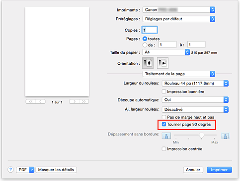 • Lorsque vous sélectionnez un papier au format portrait sous Format papier (Paper Size) dans la boîte de dialogue Imprimer et que la longueur est supérieure à la largeur sélectionnée, vous ne pouvez pas sélectionner l'option Largeur du rouleau, vous ne pouvez pas sélectionner l'option Tourner page 90 degrés.