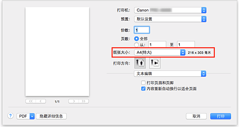 打印已创建的文档时,如果要使其填充整个纸张宽度,请从“XXX(超大尺寸)”中选择纸张尺寸(文档尺寸加上打印机操作所需要的页边距),以便按照实际尺寸打印文档的全部区域。