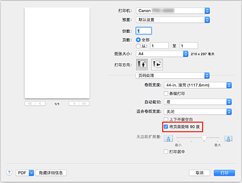 • 从打印对话框的纸张尺寸中选择纵向格式的纸张时,如果纵向的长度大于在卷纸宽度中选择的宽度,则无法使用将页面旋转 90 度