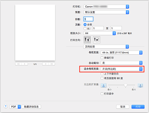 将开启(无边距)选择为适合卷纸宽度或开启(有边距)。