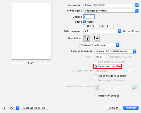 - Lorsque le paramètre « XXX sans bordure » ou « XXX feuille de découpe » est sélectionné pour Format papier (Paper Size) dans la boîte de dialogue Imprimer, l'option Impression bannière est grisée et ne peut pas être sélectionnée.