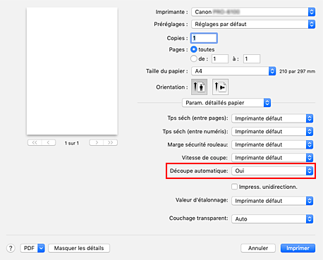 Pour couper le rouleau automatiquement et imprimer les marques de coupe, procédez comme suit :