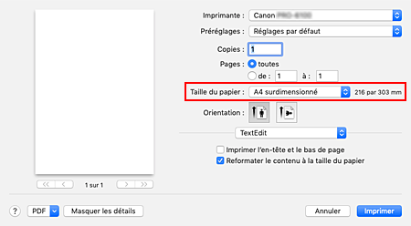 Dans la boîte de dialogue Imprimer, sélectionnez « XXX surdimensionné » pour Format papier (Paper Size).