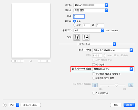 중요- 사용자 정의 용지 크기를 사용하여 전체 용지를 여백 없이 인쇄하는 경우 용지 크기(Paper Size)의 사용자 설정 크기 관리...(Manage Custom Sizes...)에서 프린터 여백(Non-Printable Area) 값을 모두 0mm로 설정하여 용지 크기를 만들고 페이지 처리(Page Processing)의 롤 용지 너비에 맞춤(Fit Roll Paper Width)에서 설정(테두리 있음)(On (Bordered))을 선택하십시오.