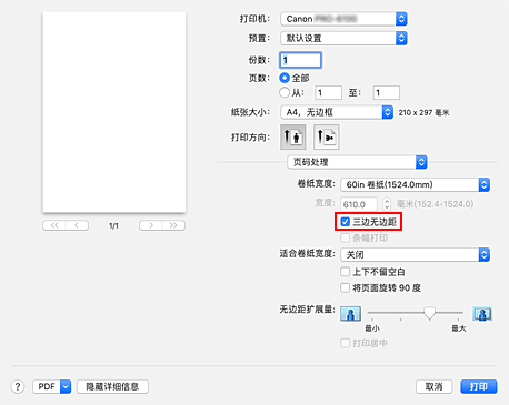 在卷纸上执行三边无边距打印