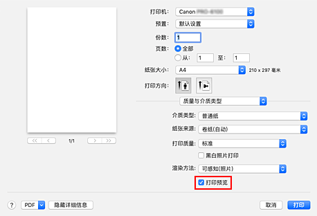 执行打印时,启动Canon imagePROGRAF Preview以显示打印效果。